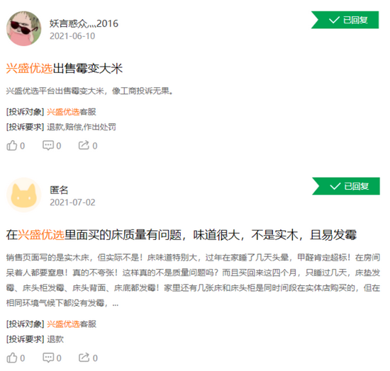 在黑猫投诉上,也有消费者表示在兴盛优选买商品,质量有问题。有人买到霉变大米,有人买的床味道很大又容易发霉。