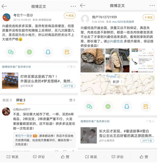 在微博上,有消费者表示,兴盛优选虽然便宜,但质量没有超市和摊贩上买的好,买了几次都踩雷。还有消费者表示,兴盛优选开遍全国,质量又达不到标准,肉类不新鲜、蔬菜长霉。