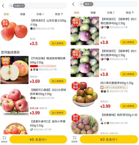比如,杭州余杭的一个自提点,山东红富士400g卖1.68元,脆李200g卖1.28元。相同的商品,定位到湖南长沙的自提点,山东红富士3斤卖10.99元,折成400g是2.93元。而脆李1斤卖6.99元,折成200g是2.79元。