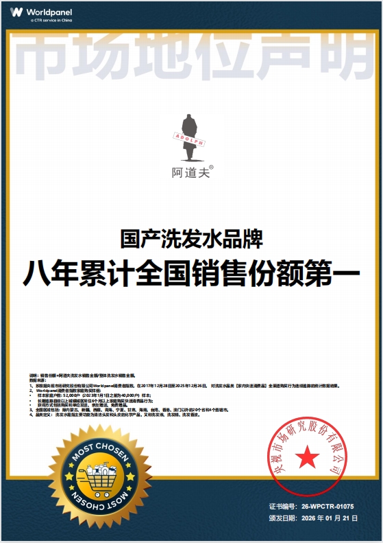 这份对质量的坚守,也直接转化为市场的认可与信赖。根据央视市场研究股份有限公司发布的Worldpanel消费者指数研究数据显示,在全国城镇常住家庭对洗发水的消费中,2017年12月28日至2025年12月26日,阿道夫累计八年的销售份额在国产品牌中排名第一。